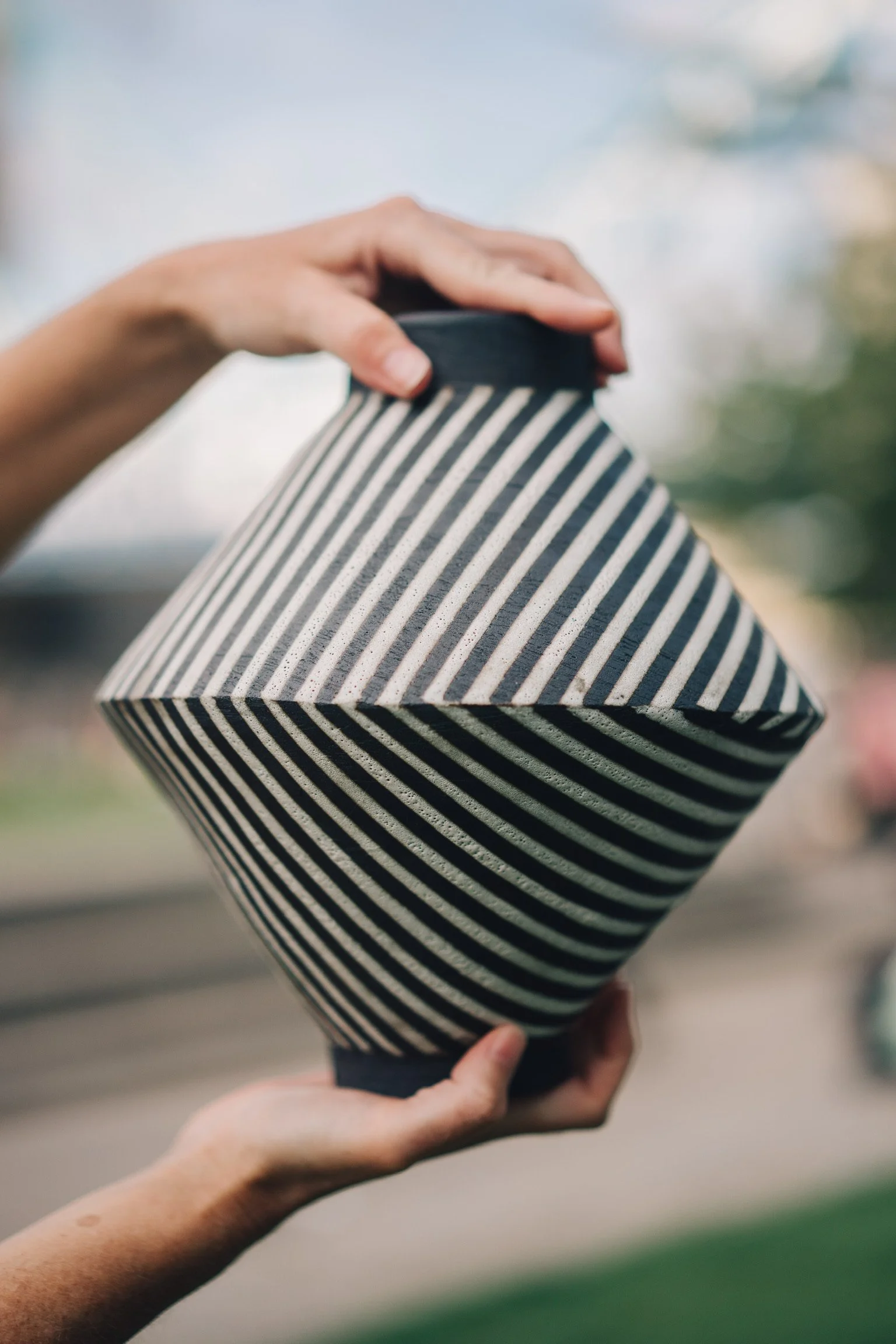 I combine my interests in art, architecture, maths and geometry by making moon jars and functional slab-built pottery decorated with bold geometric patterning.